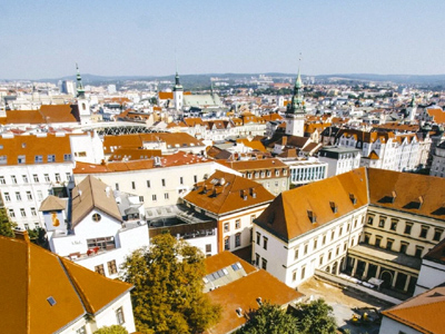 An overview of the South Moravian capital, highlighting its functionalist architecture and historic center context.
